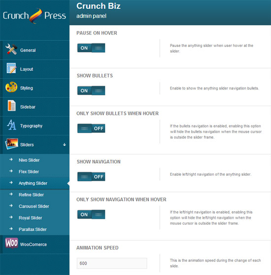 We provide 5 sliders in theme, Nivo Slider, Flex Slider, Anything Slider, Refine 3D Slider and Parallex Slider. You can highly customize each one of these from theme options panel.